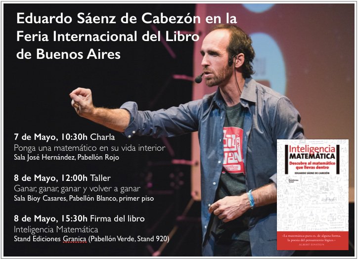 Eduardo Sáenz de Cabezón, matemático y fundador del colectivo español de monoliguistas científicos @BigVanCiencia, estará los días 7 y 8 de mayo en la Feria del Libro ofreciendo charlas, talleres y presentando su libro "Inteligencia Matemática".